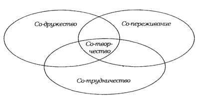 Все воспитательное пространство детской организации можно условно разделить на зоны, центром которого является со-творчесво, через которое осуществляется со-дружество, со-переживание, со-трудничество.