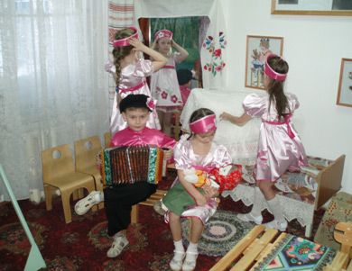 При активном участии педагогов, родителей и членов общественности в ДОУ был создан этнографический музей. В нашем музее можно все рассмотреть вблизи, а не за стеклом витрины, что-то потрогать, оценить на вес. Экспонаты музея используются в различных видах деятельности: развитие речи, музыка, игра, пение, инсценировка. Музей детского сада обеспечивает восприятие народной культуры через все органы чувств. Для самых маленьких проводятся экскурсии в историю отдельных вещей. Малыши знакомятся с предметами, которые знакомы им из любимых сказок (коромысло, туесок, короб, корыто и др.). Для детей старшего возраста в музее успешно проходят тематические занятия, инсценировки сказок, посиделки с участие родителей и других членов семей воспитанников.