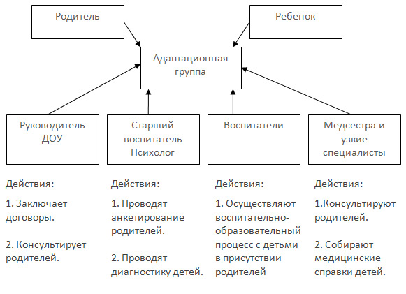 Данная группа создается для детей ясельного возраста, которые потом будут посещать данное дошкольное учреждение. В течение мая-июня родители приносят путевки заведующей ДОУ. На первой встрече происходит сбор информации о семьях будущих воспитанников. Адаптационная группа работает с 1 августа. Родителям на первой встрече вручается памятка, включающая рекомендации по уходу, воспитанию культурно-гигиенических навыков у детей ясельного возраста. Составляется график посещения адаптационной группы. Перед открытием адаптационной группы проводится родительское собрание, в котором участвуют врач, медицинская сестра, другие узкие специалисты. На собрании проводится первичное анкетирование родителей. С 1 августа начинает функционировать адаптационная группа. Дети приходят в группу на 2 часа вместе с родителями. На группе работают два воспитателя одновременно. Один воспитатель находится вместе с детьми: знакомит с группой, с игрушками, организует предметно-игровую деятельность. Другой воспитатель оказывает индивидуальные консультации родителям по уходу и воспитанию детей ясельного возраста. Ежедневно для родителей проводятся узкими специалистами семинары-практикумы или практические консультации по проблемам воспитания, развития и обучения малышей. Затем с подгруппой детей воспитатель проводит занятие, на котором присутствуют и принимают активное участие родители. Когда ребенок привыкнет к воспитателю и к группе, родитель может оставить его одного сначала на 30 минут, затем на 1 час и два часа. С 1 сентября группа начинает функционировать в обычном режиме. Медиками, старшим воспитателем, воспитателями проводится первичная диагностика каждого ребенка, чтобы проследить динамику физического и психического развития детей.