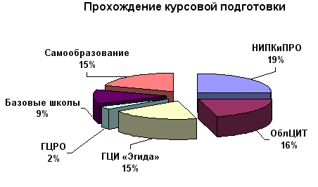 Как видно из приведенных диаграмм половина наших слушателей имели предварительную подготовку в области информационных технологий до прихода к нам в центр на обучение. Хочется отметить достаточно высокий процент самообразования педагогов.