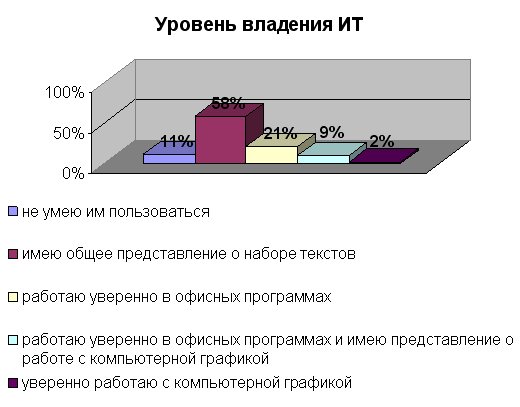 В Городском центре информатизации «Эгида» еженедельно проводится обучение педагогов города информационным и коммуникационным технологиям по различным программам. С целью определения уровня владения компьютерными технологиями слушателей курсов и состояния информатизации в их образовательных учреждениях в центре «Эгида» проводится входное анкетирование. Педагогам предлагается ответить на ряд вопросов путем выбора наиболее приемлемого для них варианта ответа из предложенных в анкете. На данный момент опрошено более 270 слушателей. В данной статье представлены некоторые результаты этого опроса.