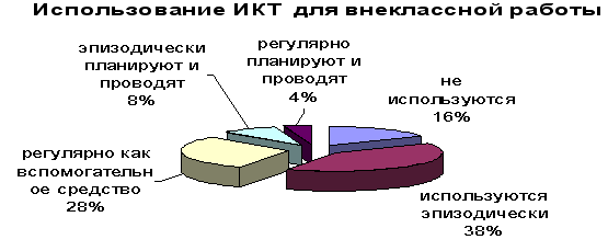 Из диаграммы, отражающей состояние применения информационных технологий для проведения внеклассной работы видно, что первые шаги в этом направлении сделаны, но требуется систематизация накопленного опыта и его распространение.