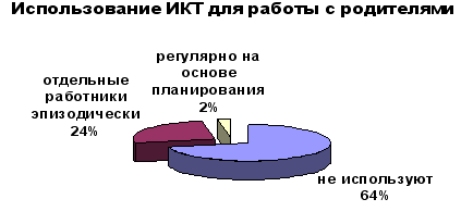 Учитывая факт глубокого внедрения компьютерной техники во все сферы нашей жизни, логично предположить, что многие родители применяют те или иные информационные технологии в своей профессиональной деятельности, следовательно, образовательному учреждению стоит чаще применять ИКТ при работе с родителями, о чем свидетельствуют результаты анкетирования.