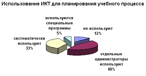 Заметно лучший результат дает опрос по проблемам планирования учебного процесса и контроля за ходом этого процесса. Из диаграмм видно, что 48% администраторов образовательных учреждений контролируют учебный процесс с помощью компьютерных технологий, а 33% занимаются этим уже в системе. Отрадно отметить факт применения специальных программ при планировании учебного процесса в образовательном учреждении.